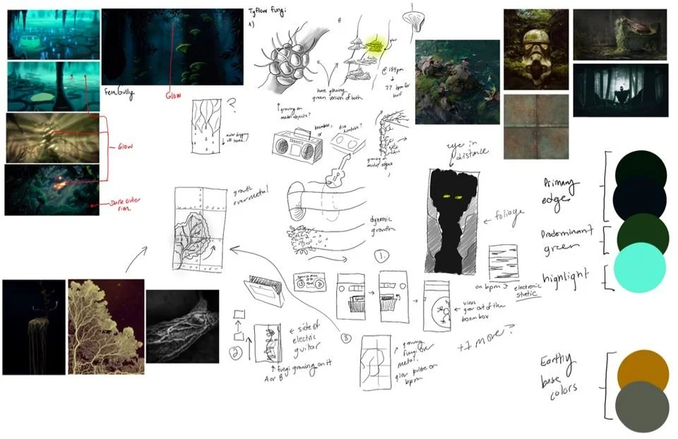 When I happened upon this song, I was immediately transported into an urban apocalyptic world filled with mechanical objects taken over by botanical growth. I imagined plants with sickly neon green and blue colors on a dark background. Movies like Fern Gully and mythical locations like Star Wars’ Endor came to mind, where bright foliage coincides with man-made objects.