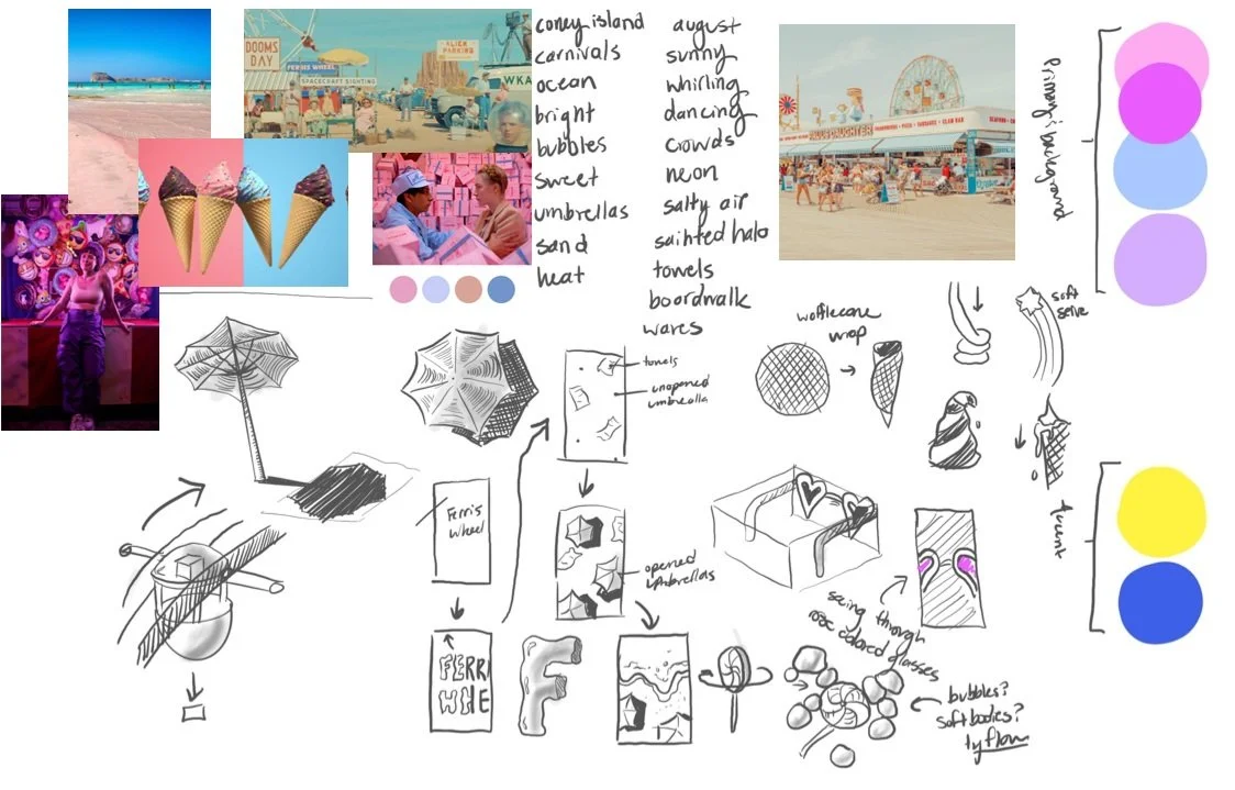 To me, the lyrics of “Ferris Wheel” create a vivid image of something lighthearted and bright. Since the song references amusement park rides, I thought of carnivals near the beach. I have vibrant pastels coloring summer imagery such as umbrellas, sunglasses and the ocean. The bubbliness of the song reminded me of more childlike wonders such as balloons, ice cream and confetti -creating a warm, sunlit and carefree summer party.