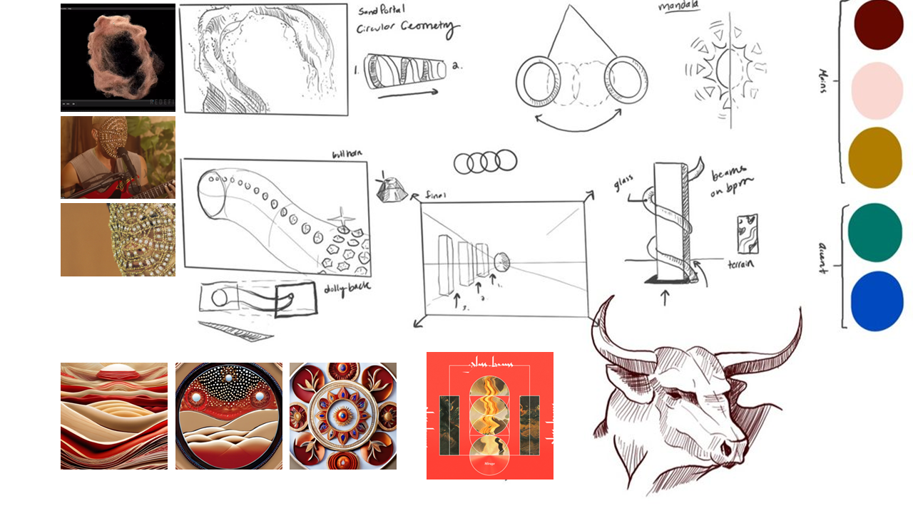 “Glass Beams” creates psychedelic rock songs that tie in their Indian heritage. I pulled on images of the desert, shapes such as circles and pillars, warm tones and materials like rubies, gold and porcelain. To me, the song has very dramatic falls similar to a bull preparing to charge, which led me to time scene changes with the music. I used AI to generate images of the song’s title as well, which brought up ideas of mirages and mandalas.