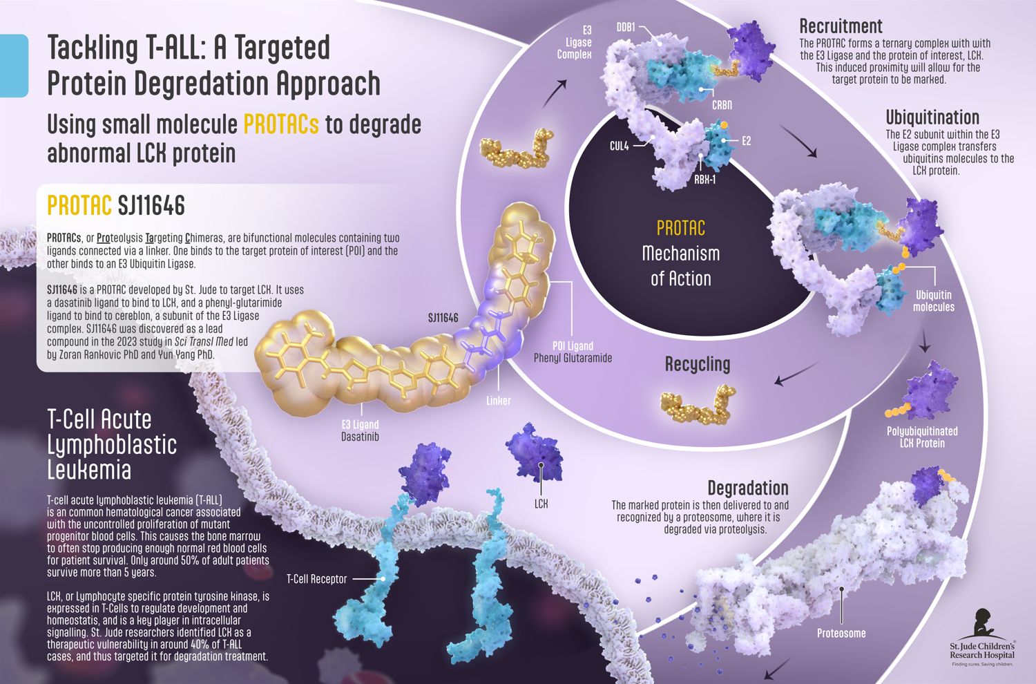 I developed a thorough molecular infographic on the subject of PROTACs. It was used to educate those external to the chemical biology field, but who understand other aspects of molecular science. Using a bit more description of certain aspects of the mechanism and 3D protein structures, I tried to create a visual environment that promoted easy learning.